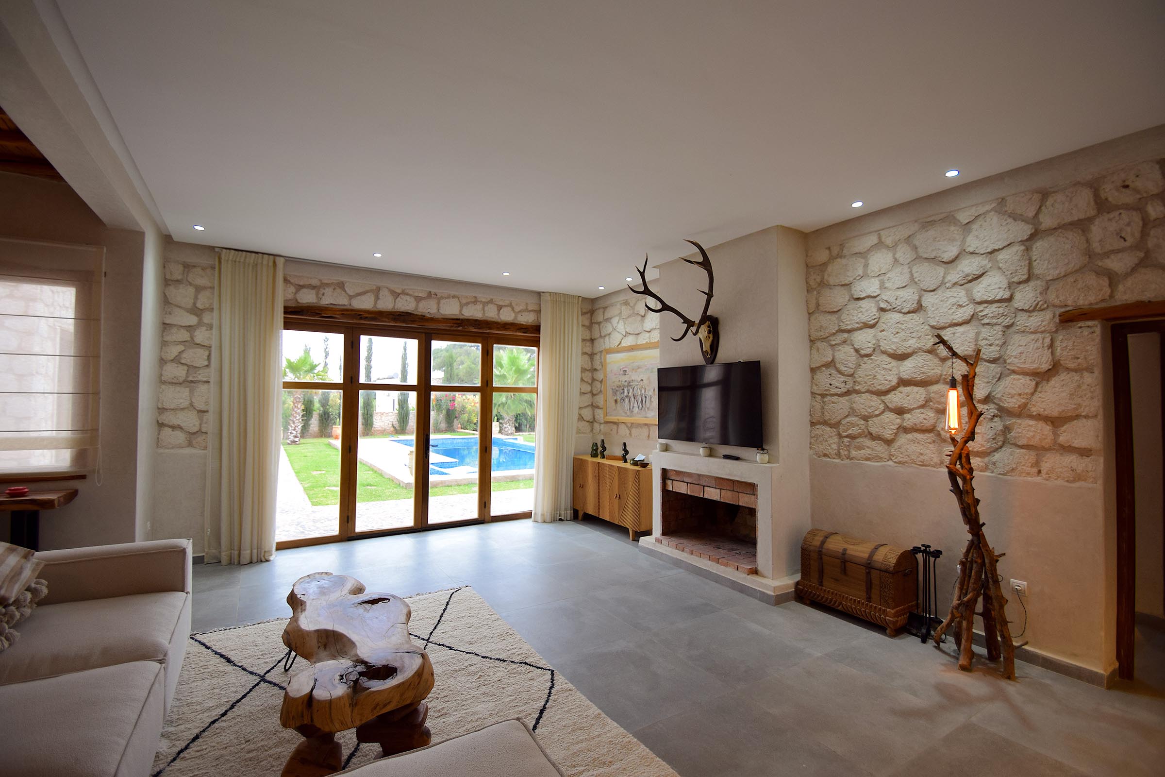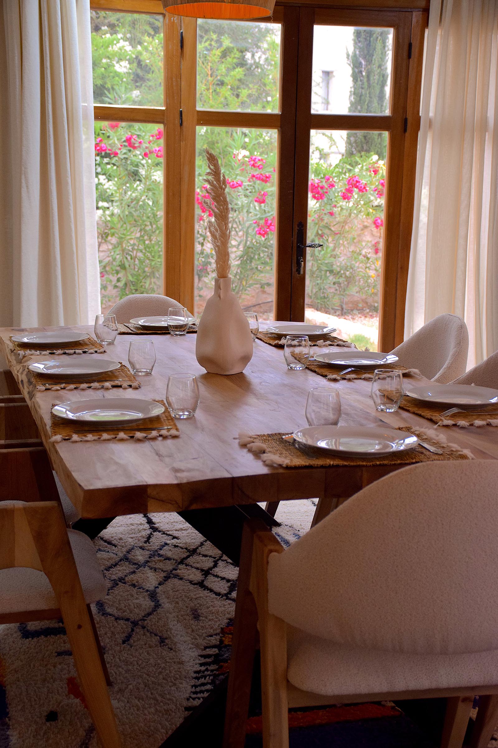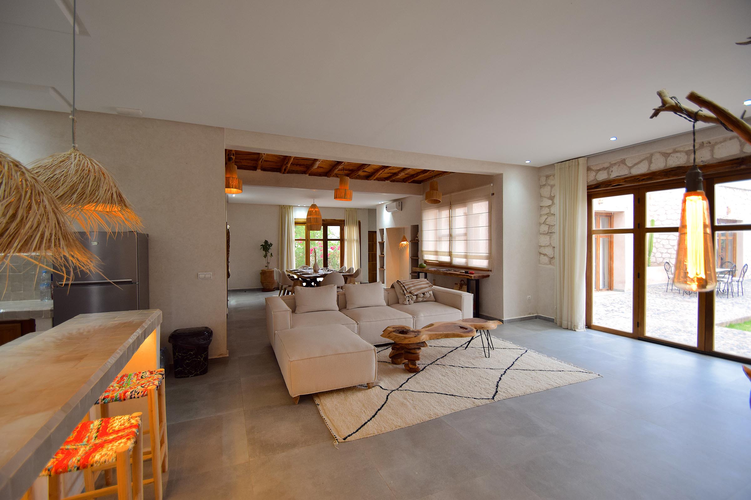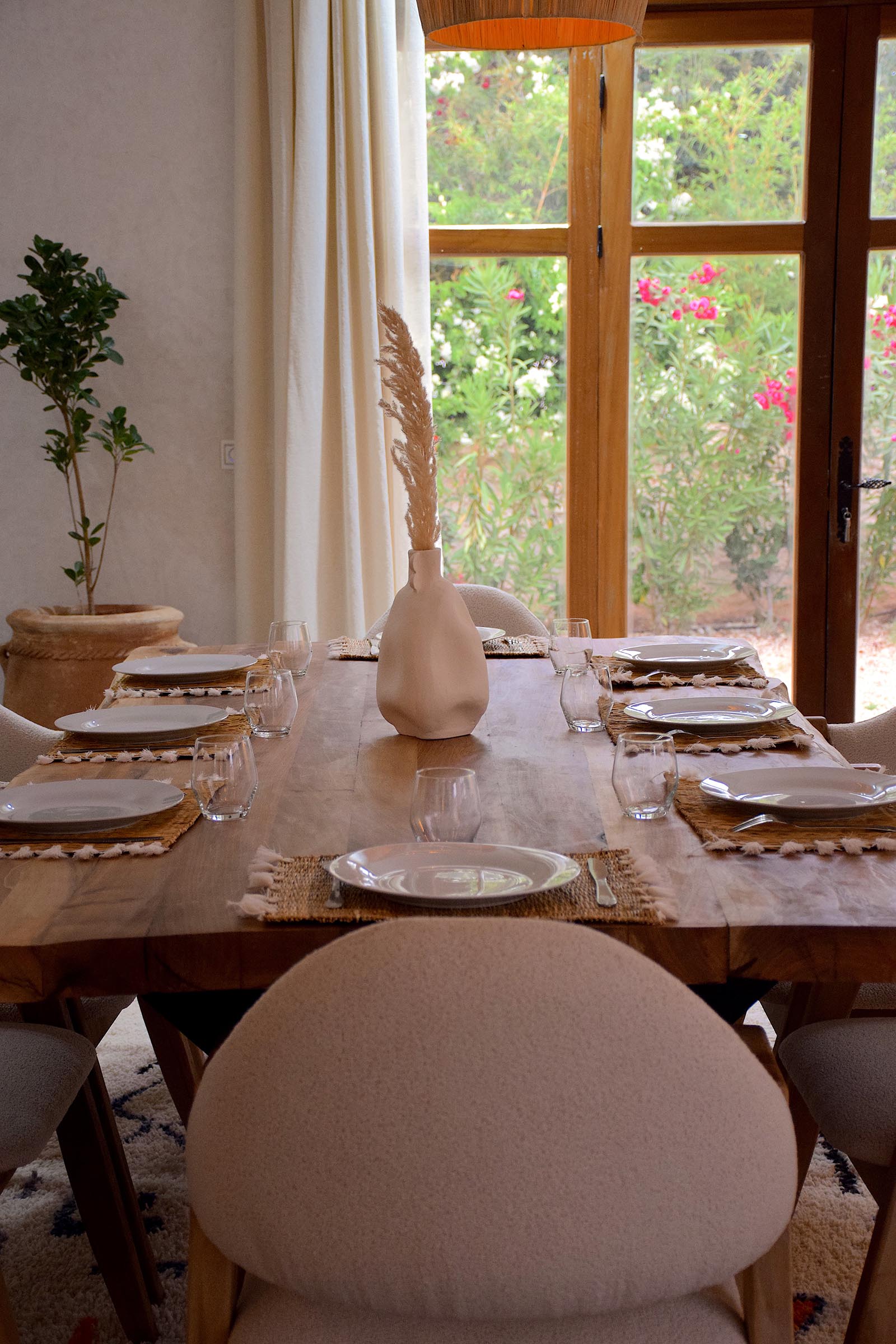 La villa mêle style beldi chic et matériaux marocains (tadelakt, bejmat, bois flotté, pierre d’Essaouira…), dans une palette douce de beiges, blancs et caramel.