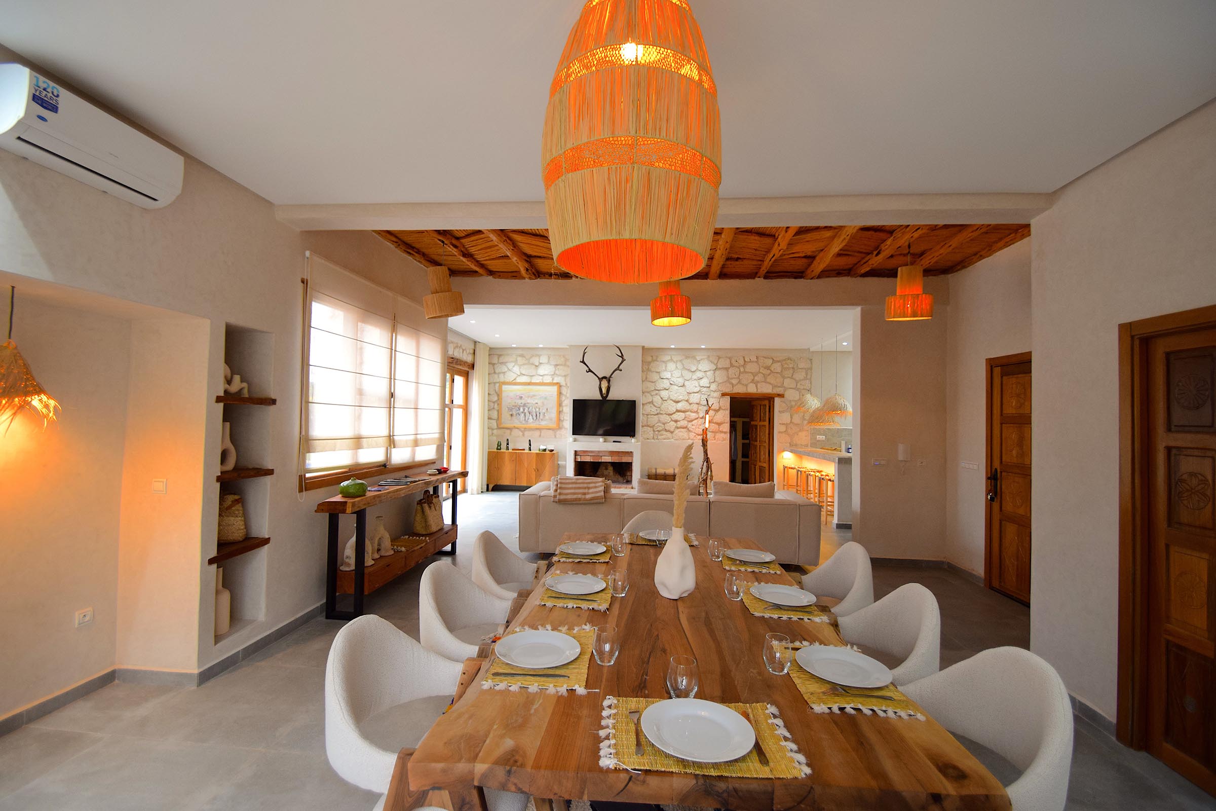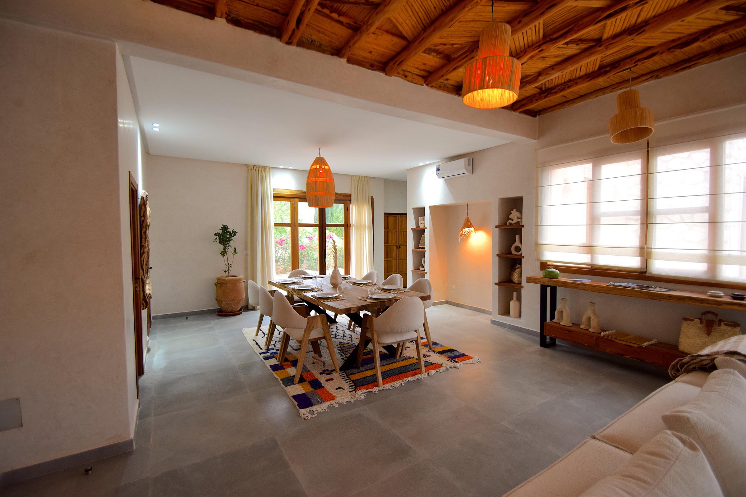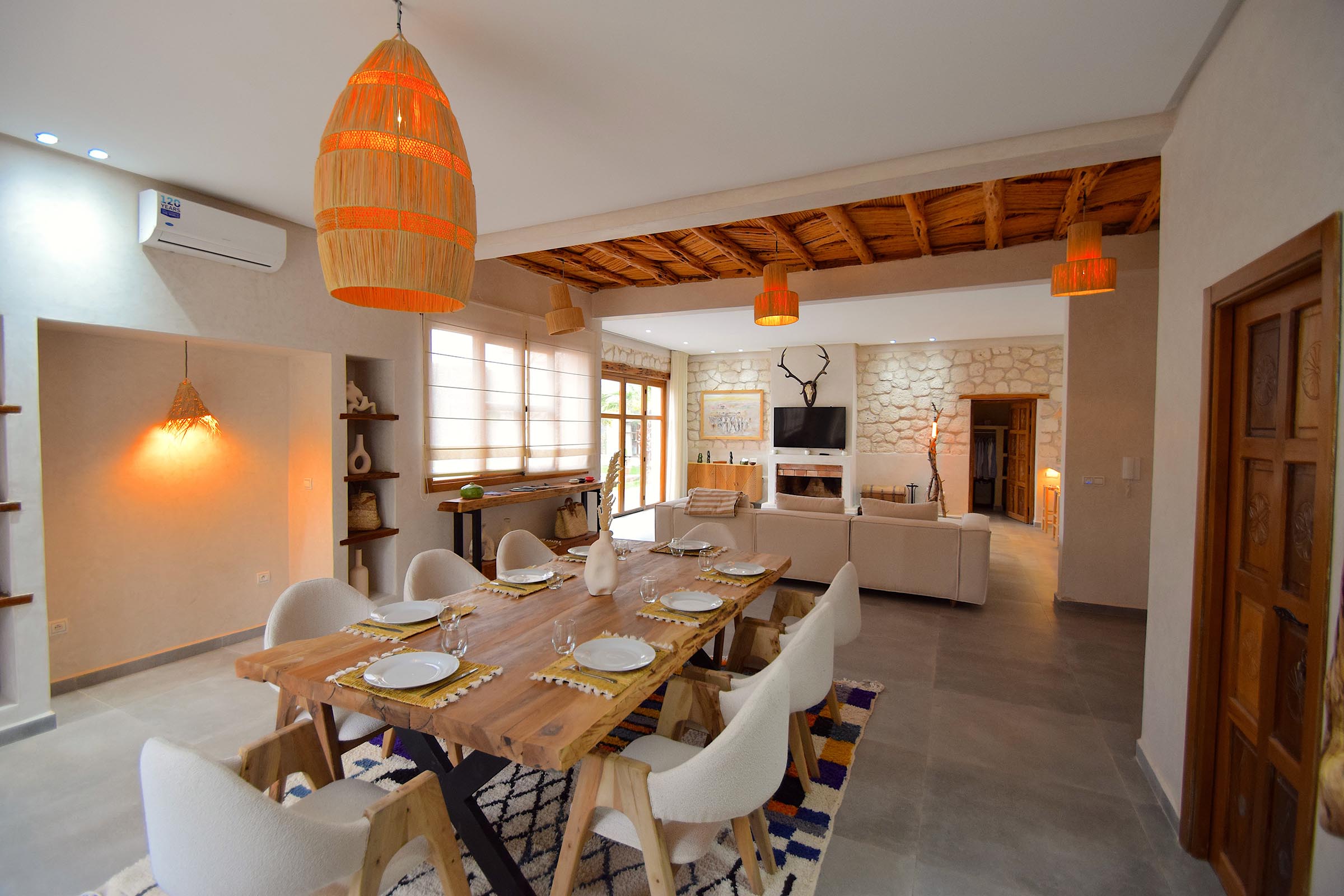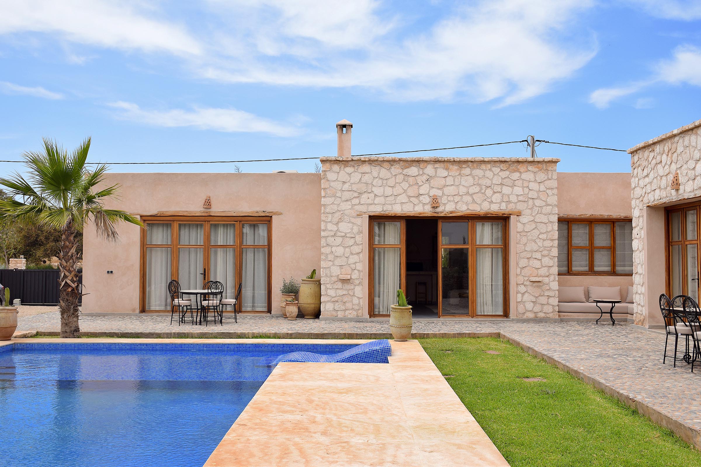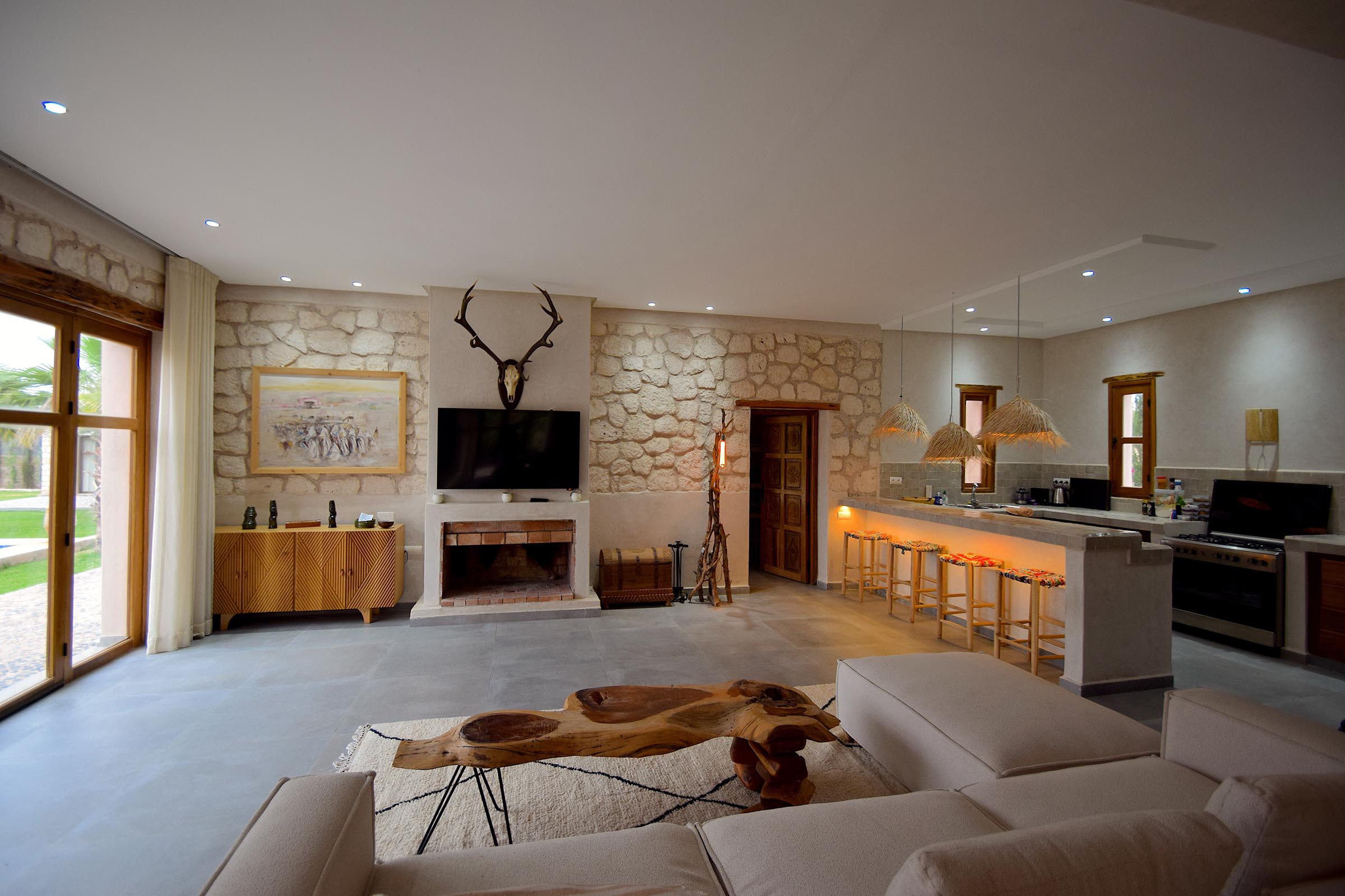 La villa mêle style beldi chic et matériaux marocains (tadelakt, bejmat, bois flotté, pierre d’Essaouira…), dans une palette douce de beiges, blancs et caramel.