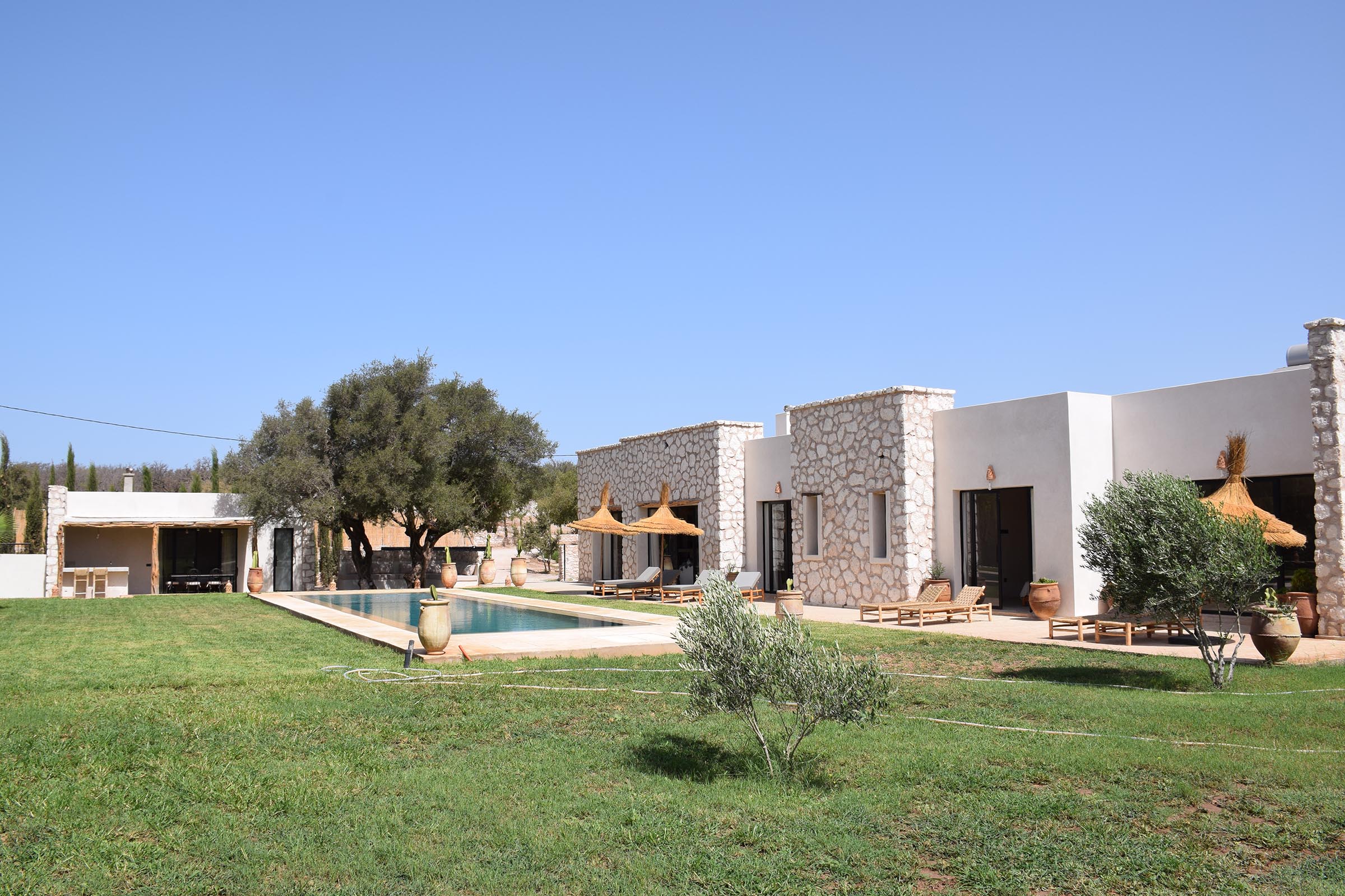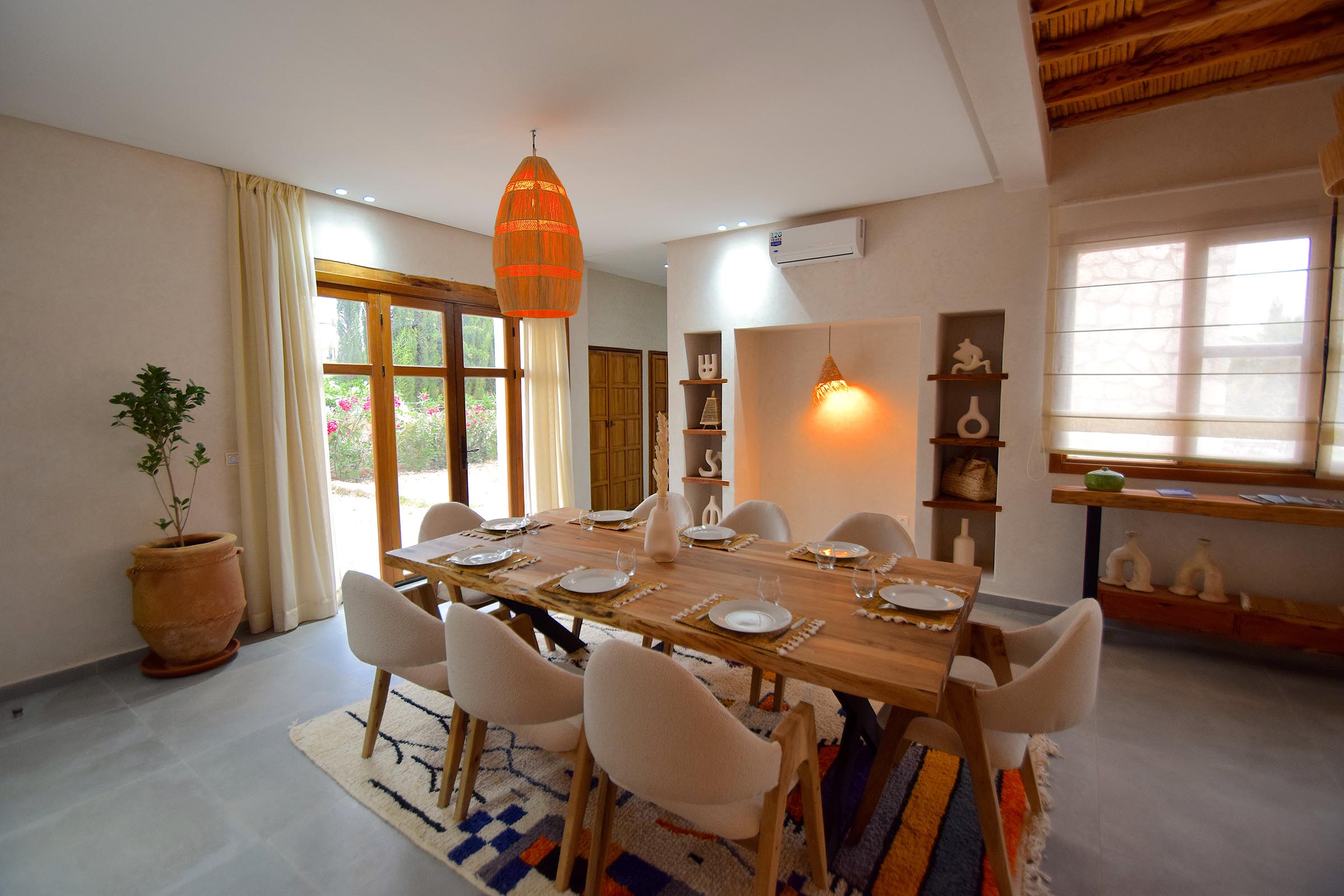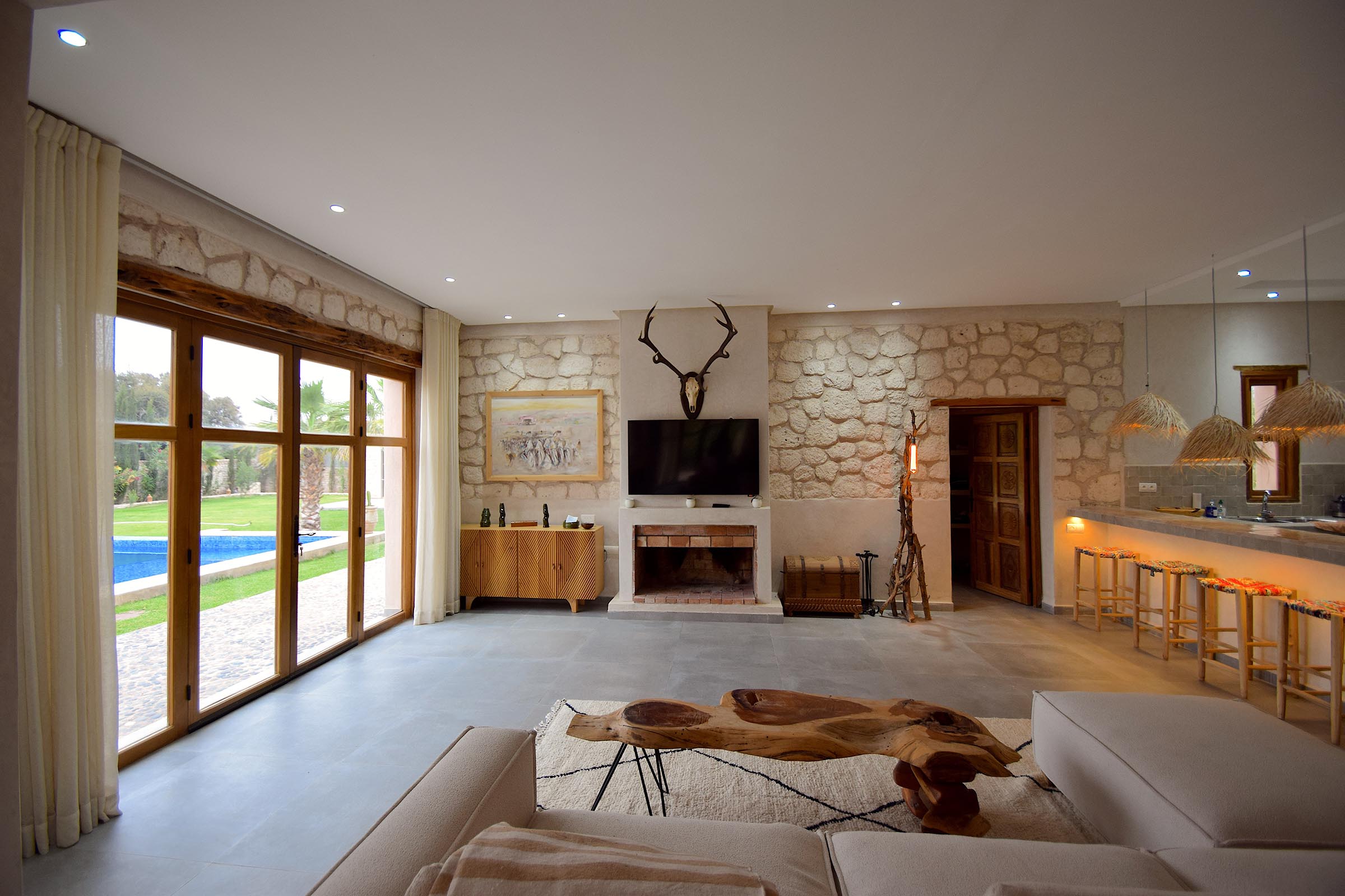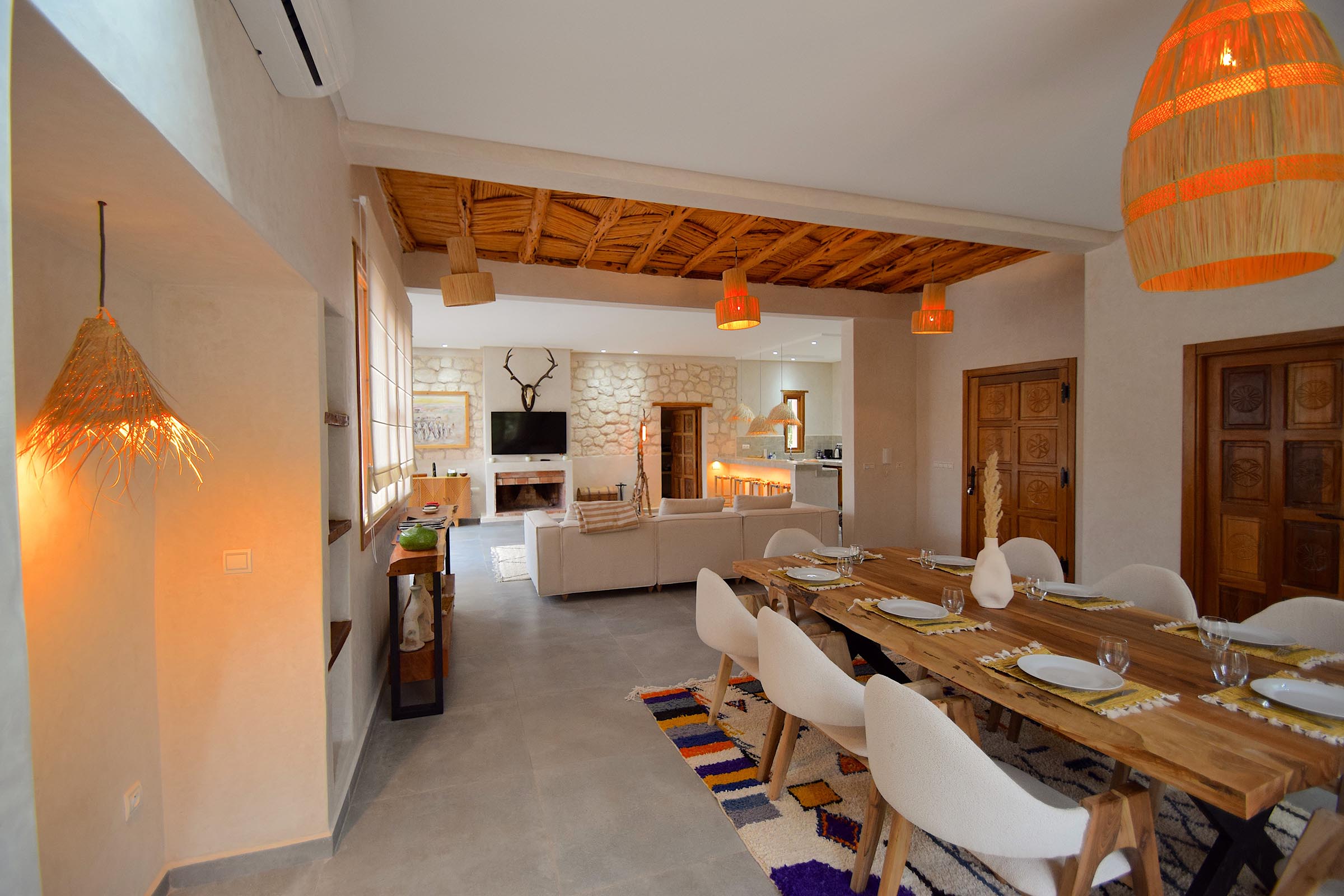 La villa mêle style beldi chic et matériaux marocains (tadelakt, bejmat, bois flotté, pierre d’Essaouira…), dans une palette douce de beiges, blancs et caramel.