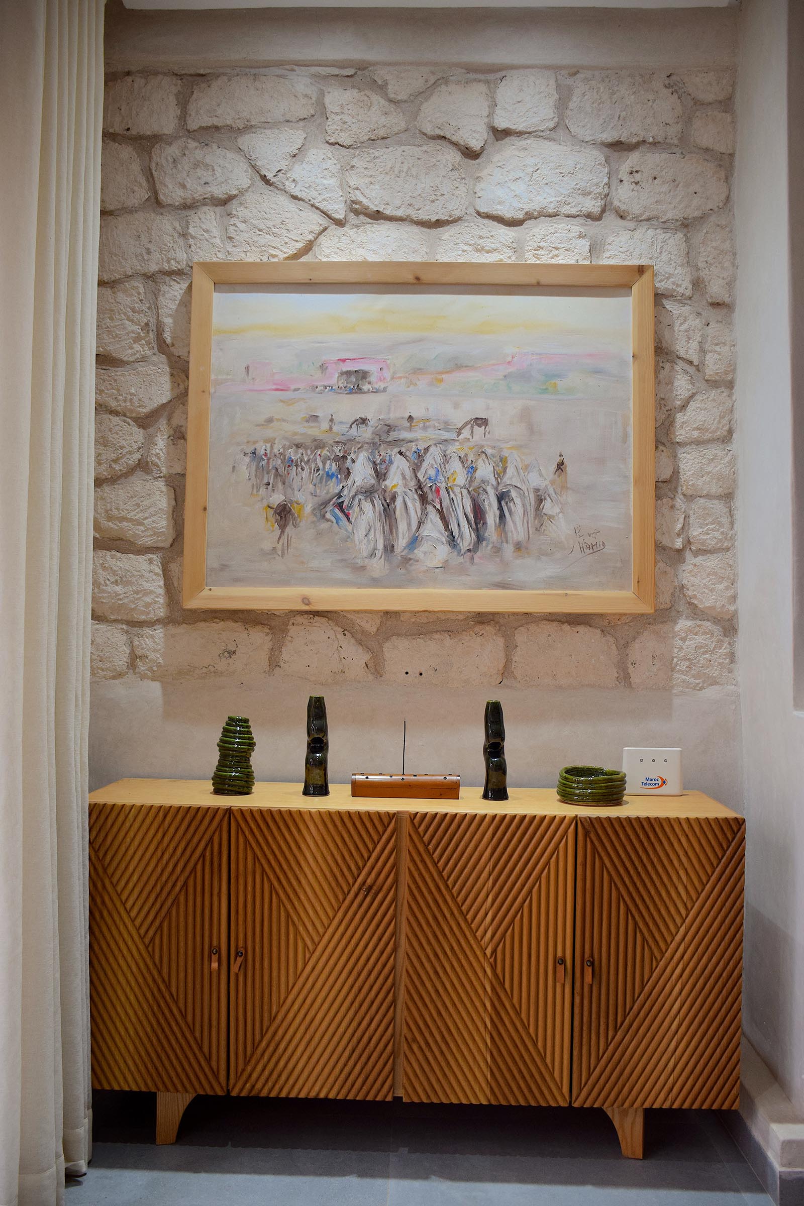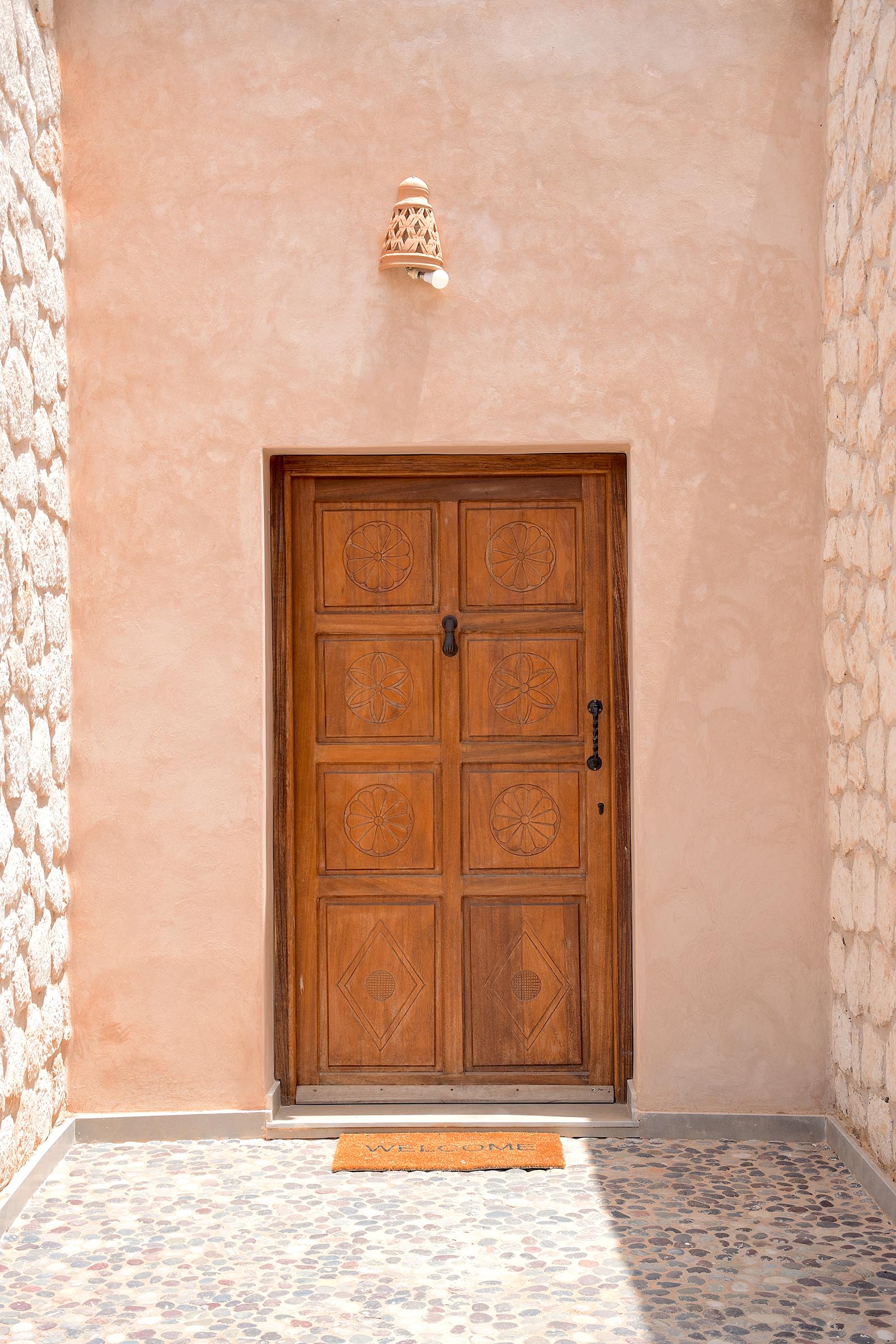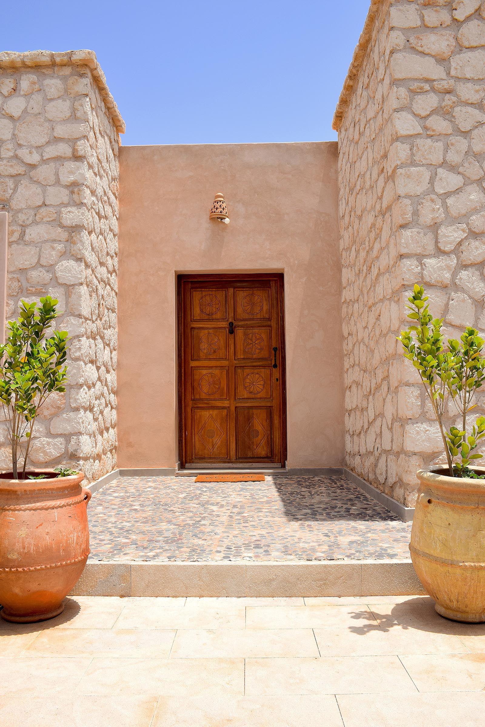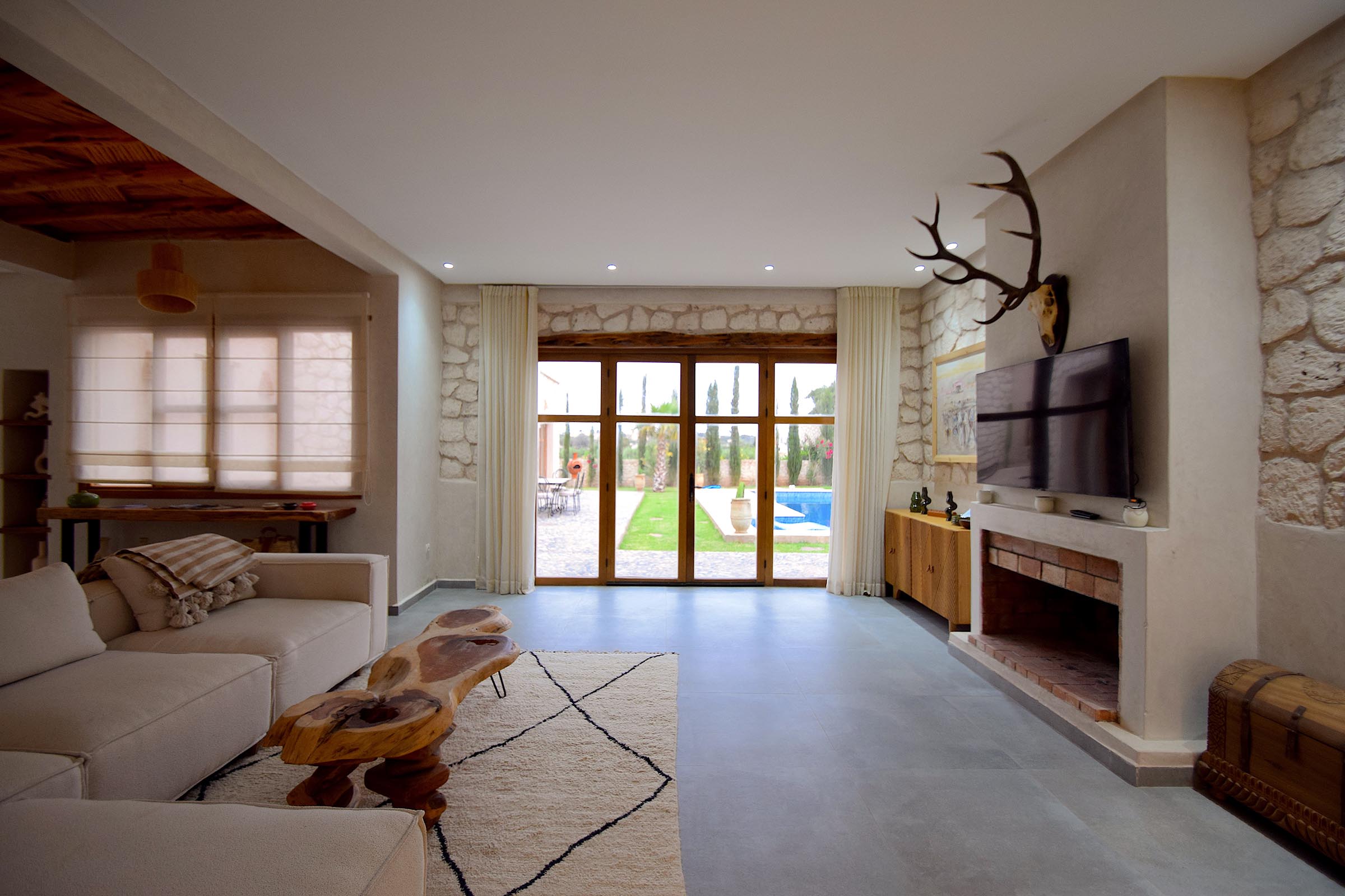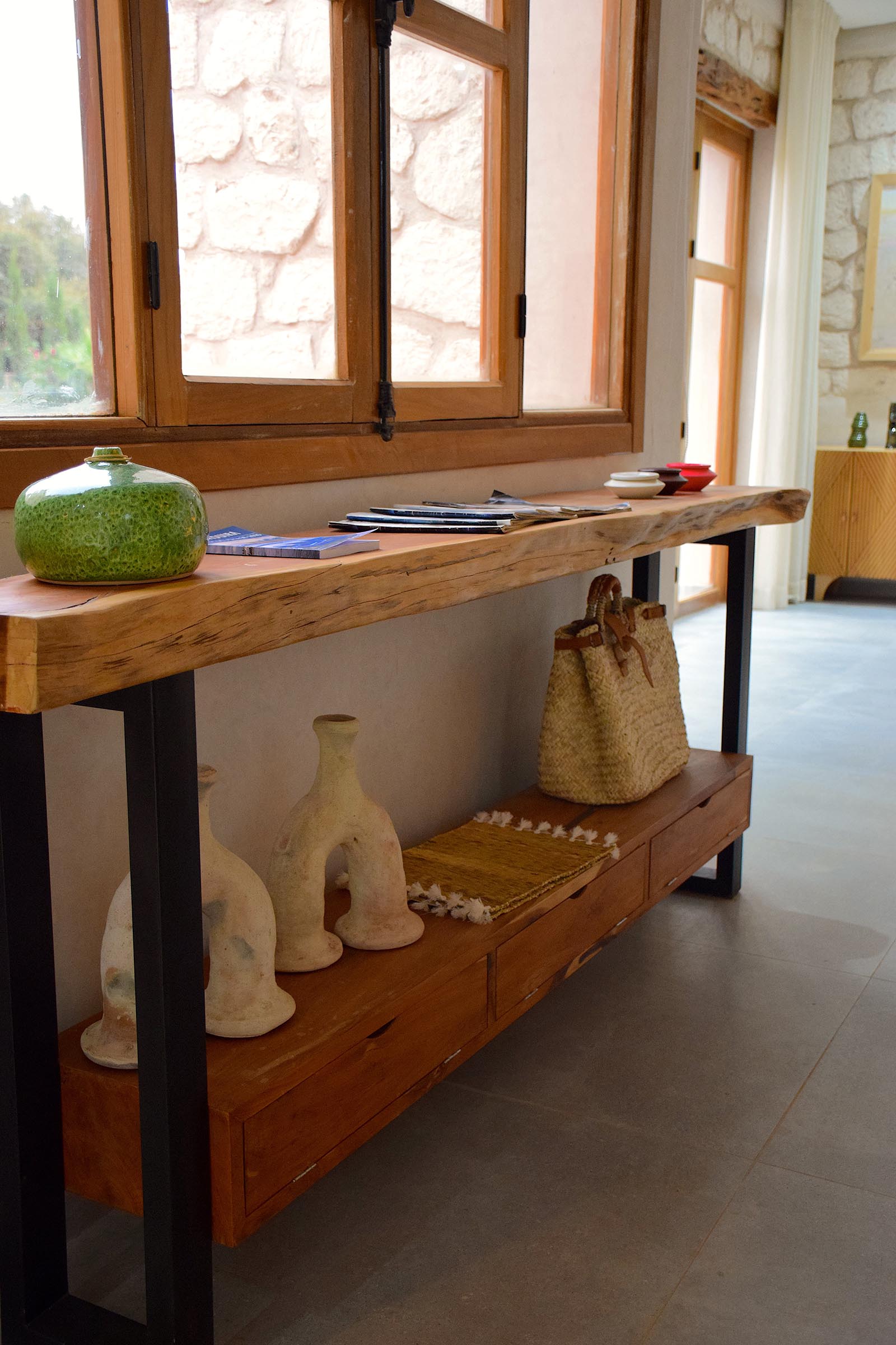 La villa mêle style beldi chic et matériaux marocains (tadelakt, bejmat, bois flotté, pierre d’Essaouira…), dans une palette douce de beiges, blancs et caramel.
